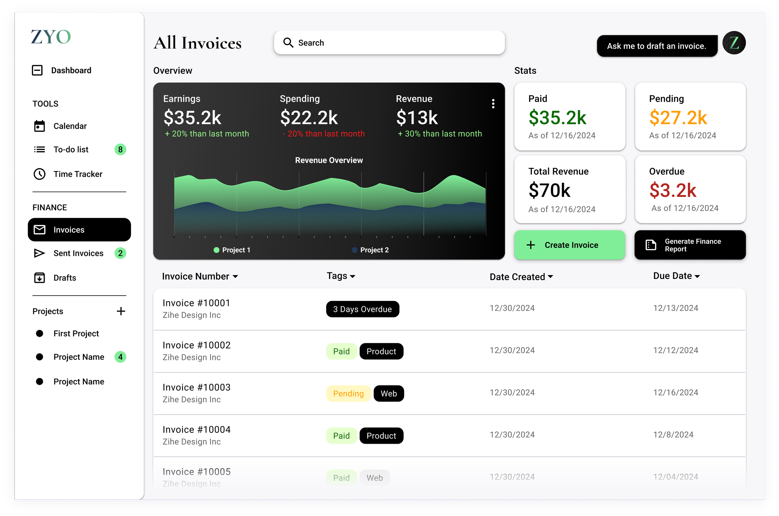 The Invoice page provides a quick finance overview of all recent projects. From here, users can create and send invoices, generate finance reports, and stay updated on the status of all sent invoices.