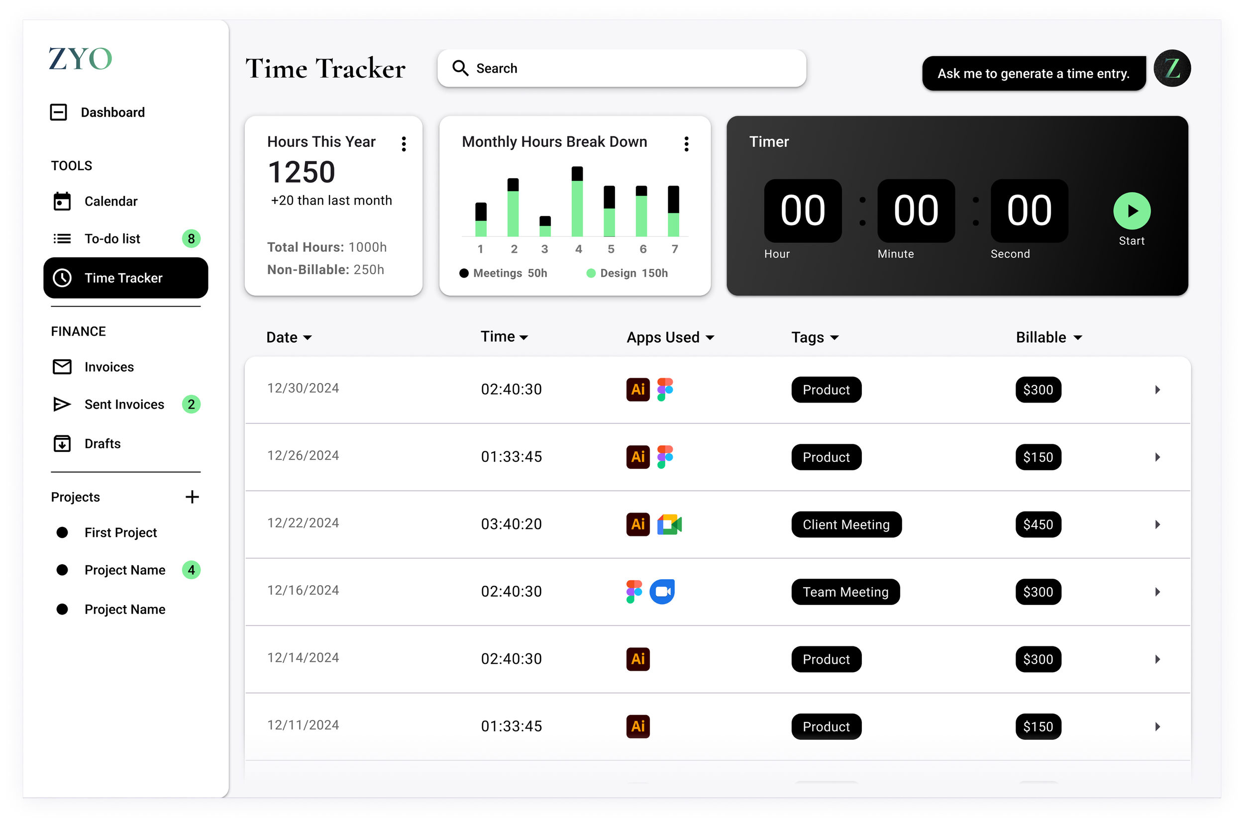 That insight sparked an idea: What if ZYO could do the same for creative work? Instead of asking users to start a timer, ZYO could detect when work begins—like opening design software or switching into "focus mode"—and track hours automatically. This small shift could solve a major pain point: forgetting to track billable time.