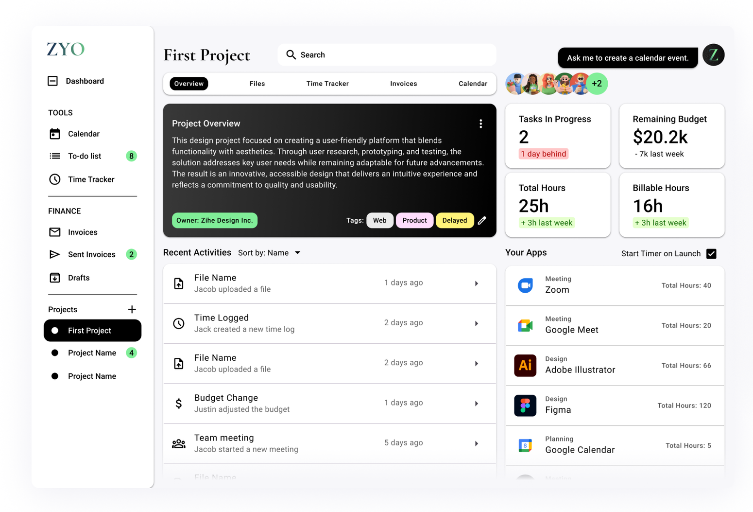 ZYO is a platform designed to help freelancers simplify project management, time tracking, and invoicing. The name "ZYO" comes from the Mandarin word "自由" (zìyóu), meaning "freedom." My goal is to give freelancers that sense of freedom by taking the hassle out of administrative tasks, so they can focus on what they love doing.